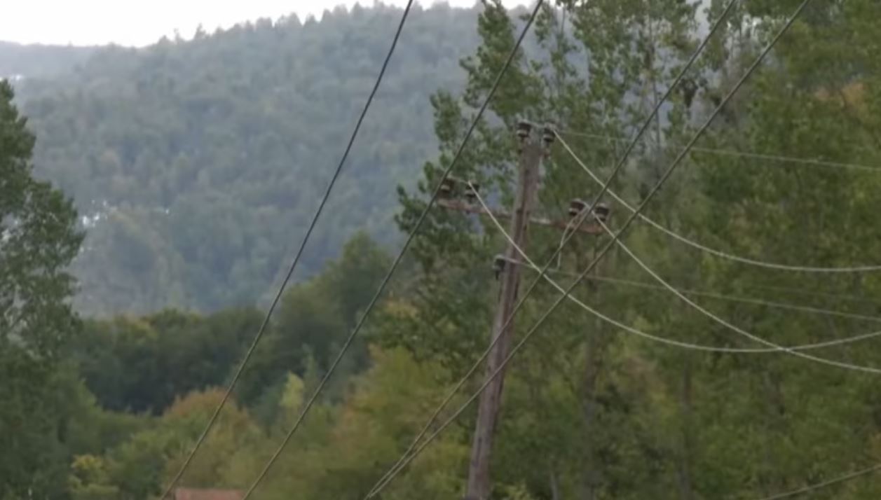Pasi disa shtylla elektrike janë rrëzuar, ndërsa tela të dëmtuar shihen të kalojnë në mes tëpemëve.