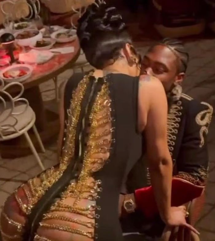 Cardi B tregoi të pasmet e saj të famshme me një fustan të zi me detaje zinxhiri të artë, ndërsa puthte të dashurin e saj, Stefon Diggs, gjatë festës së 32-vjetorit të tij në Miami.