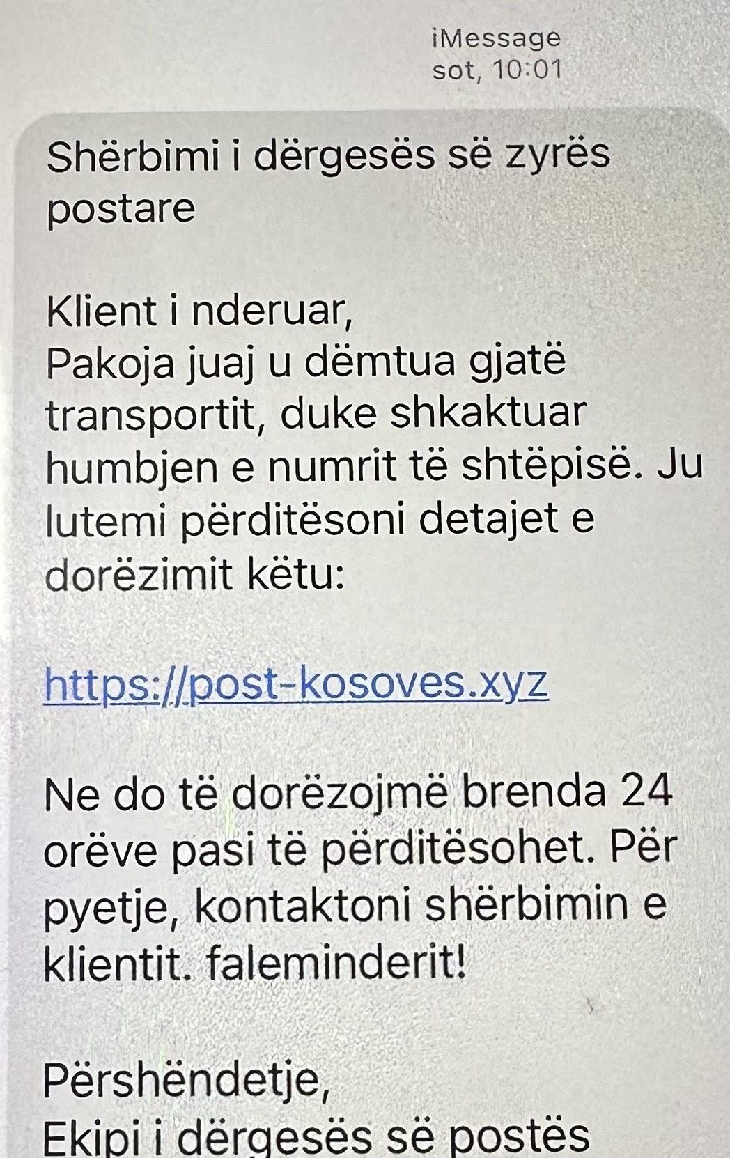 Jemi duke vërejtur një rritje të ankesave të qytetarëve për raste të mashtrimeve përmes mesazheve telefonike (SMS), ku qytetarët pranojnë mesazhe që përmbajnë Link-e të dyshimta dhe duke klikuar në këto linke, mashtruesit mund të fitojnë casje në llogaritë bankare të qytetarëve ose të dhëna tjera personale me c’rast nga llogarit bankare në mënyrë të paligjshme të dyshuarit përfitojnë të holla.