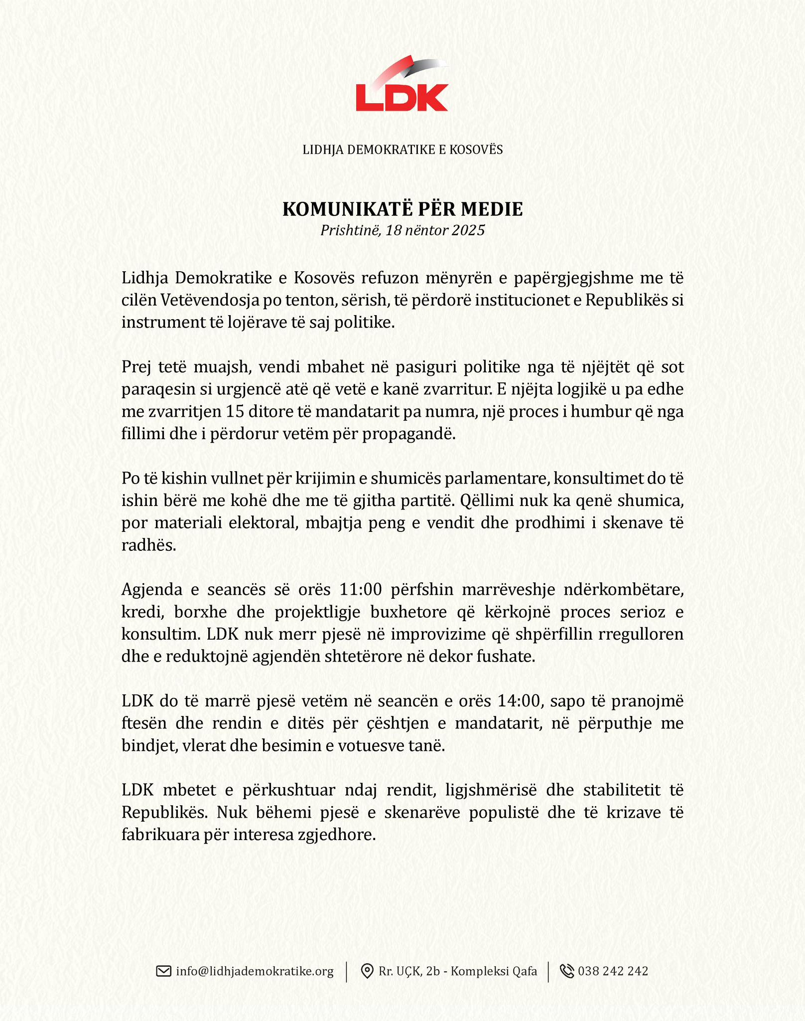 Lidhja Demokratike e Kosovës, ka njoftuar nuk do të marrë pjesë në seancën e nesërme ku parashihet votimi i buxhetit për vitin 2026-të.