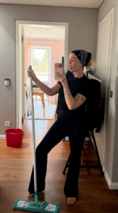 E veshur në menyrë sportive, me shami në kokë, Loredana shihet duke pastruar shtëpinë me leckë dyshemeje.