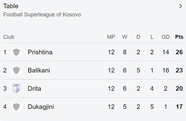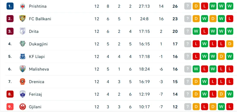 FC Prishtina kryeson me 26 pikë pas 12 xhirove (8 fitore, 2 barazime, 2 humbje), me golaverazh 27‑13.