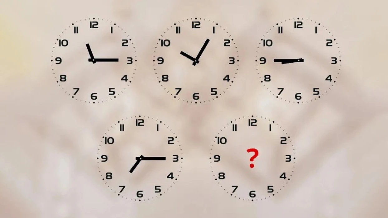 Siç shihet në figurë, paraqiten pesë orë, nga të cilat katër tregojnë kohën: 11:15, 10:05, 8:45 dhe 7:15, ndërsa detyra juaj është të zbuloni sa duhet të tregojë ora e fundit, e vetmja pa akrepa.