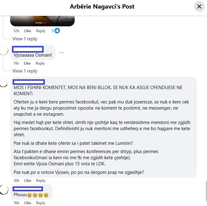 Madje, dikush u ankua se po fshihen komentet e tyre, teksa ia drejtoi Nagavci një pyetje direkte: “Pse nuk po e votoni Vjosën, por po na dërgoni prapë në zgjedhje?”