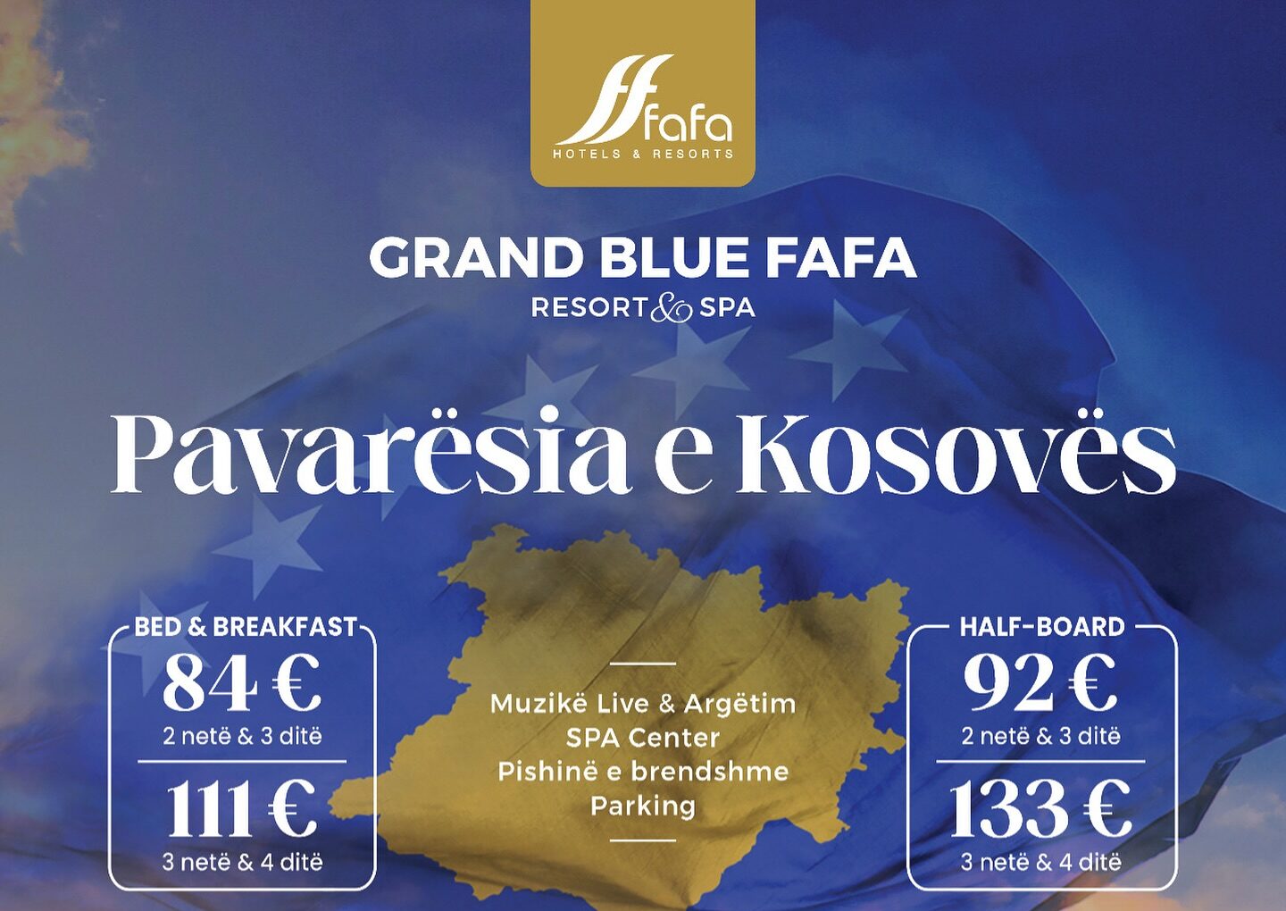 Në bregdetin magjepsës të Golemit, mes tingujve të valëve dhe një atmosfere relaksuese, Grand Blue Fafa Resort & Spa ju fton të festoni Pavarësinë e Kosovës me një ofertë të veçantë. Për disa ditë larg përditshmërisë, ky resort luksoz do të bëhet vendi ideal për të shijuar qetësinë, ushqimin e shkëlqyer dhe shërbimet ekskluzive.
